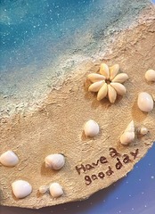 丸いキャンバスに本物の貝をつけました^ ^